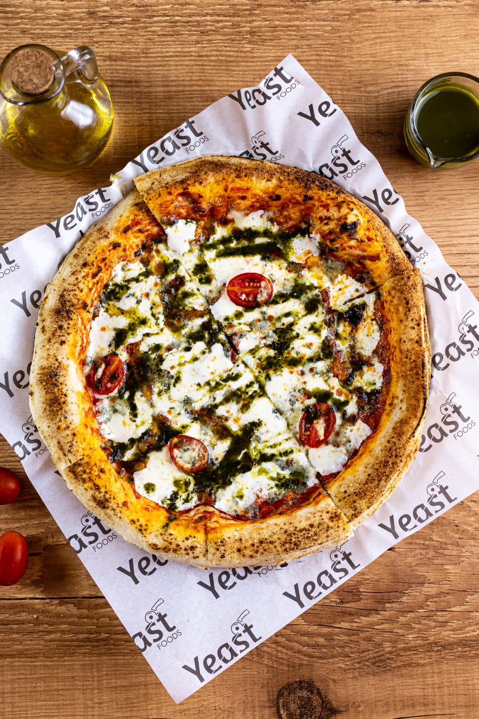 Mozzarella fior di Latte, gorgonzola, tomate confit e molho pesto.